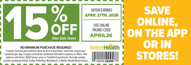 Information presented here is for educational purposes only; statements about products and health conditions have not been evaluated by the U.S. Food and Drug administration. Not responsible for typographic or printing errors. See coupons for full details, restrictions and expiration dates. Coupons MUST be presented at time of purchase. No Grace Period. Coupons CANNOT be combined with any other coupon or offer. Limit One coupon per customer per day. Offers and coupons apply to walk-in stores only. Not valid on prior purchases or trade purchases. Excludes beer, wine and prepared foods.